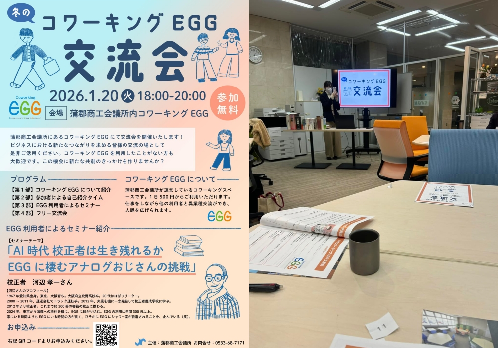 2026年1月20日、蒲郡商工会議所が運営するコワーキングEGGで開催された交流会にコワーキングネットワークのメンバーも参加してきました。